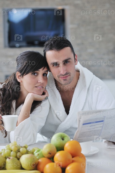 Счастливая молодая пара читает газету на современной кухне