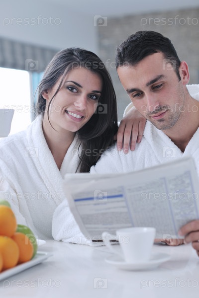 Счастливая молодая пара читает газету на современной кухне