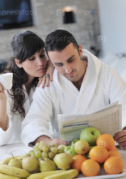 Молодая пара читает газету за завтраком
