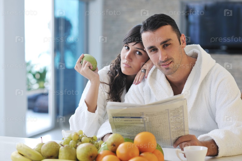 Молодая пара читает газету за завтраком