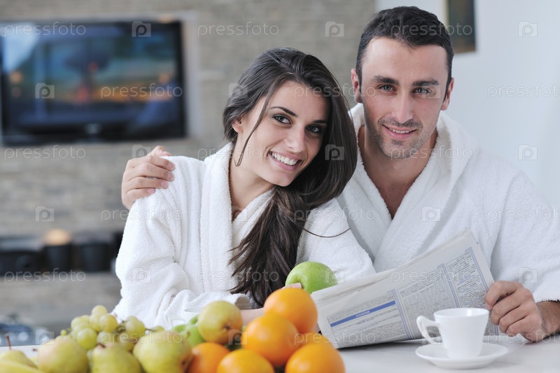 Счастливая молодая пара читает газету утром на кухне