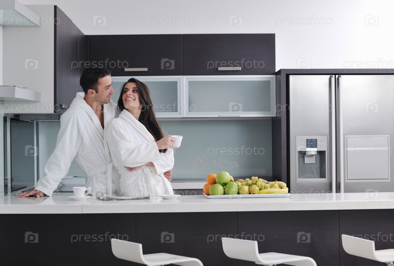 Счастливая молодая пара на современной кухне
