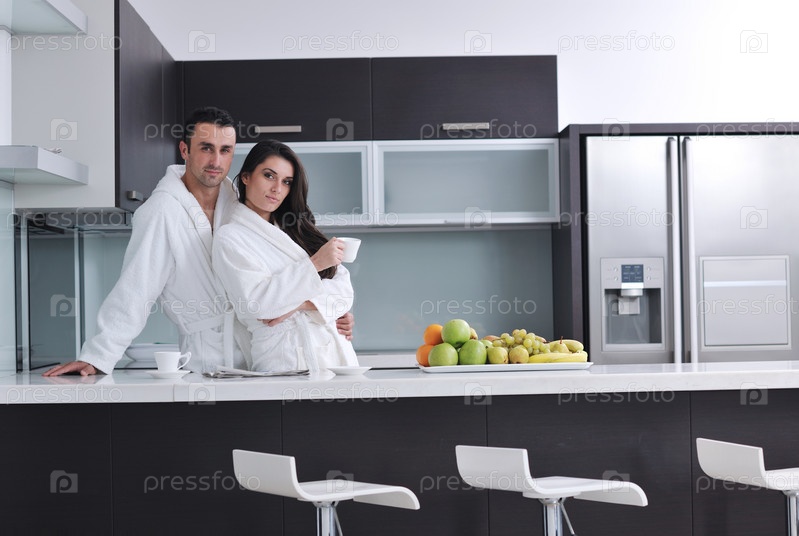 Счастливая молодая пара на современной кухне