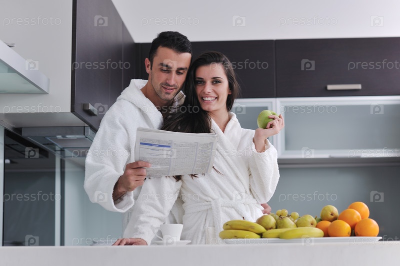 Счастливая молодая пара на современной кухне