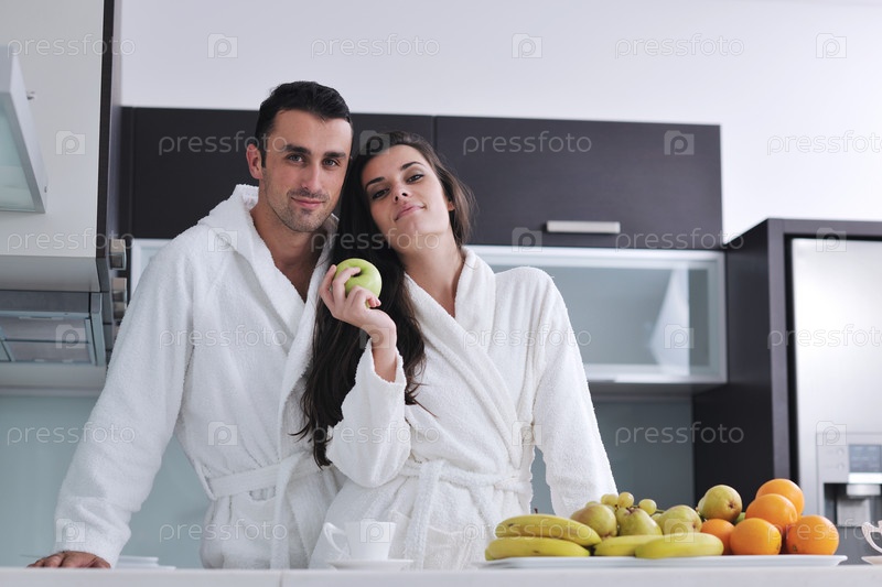 Молодая пара с зеленым яблоком на кухне