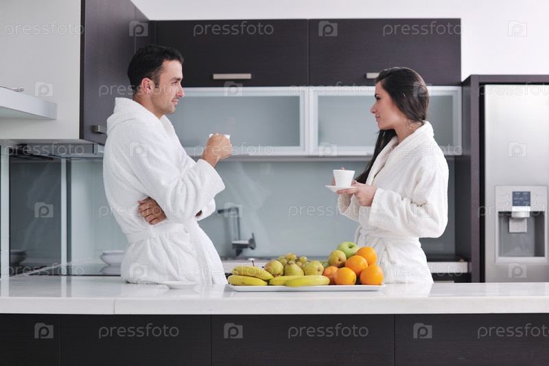 Молодая пара пьет кофе утром на кухне