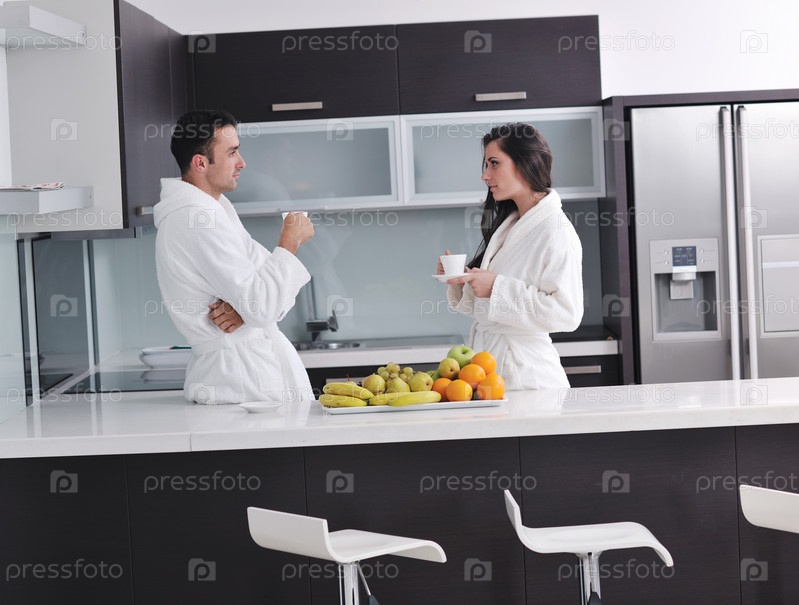 Молодая пара пьет кофе утром на кухне