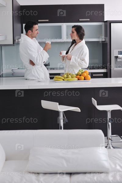 Молодая пара пьет кофе утром на кухне