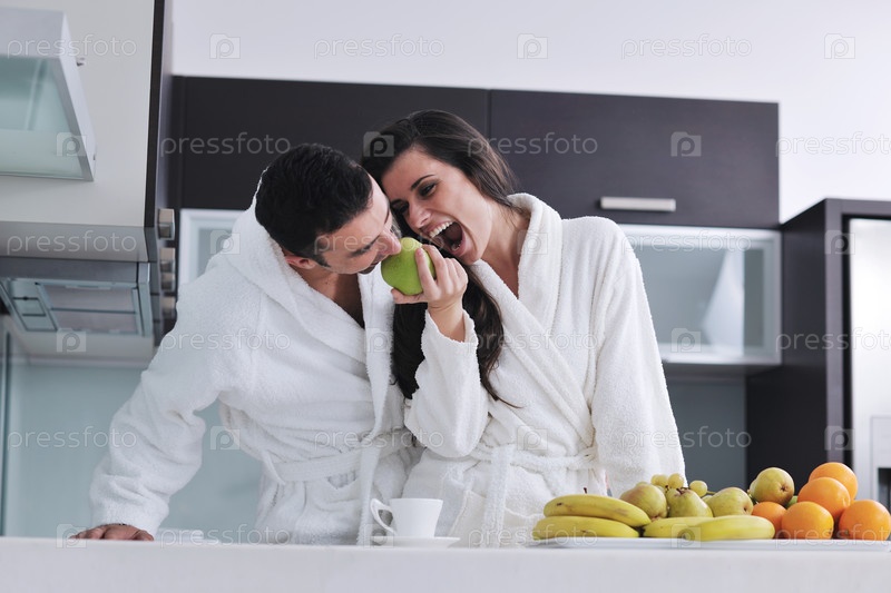 Молодая пара с зеленым яблоком на кухне