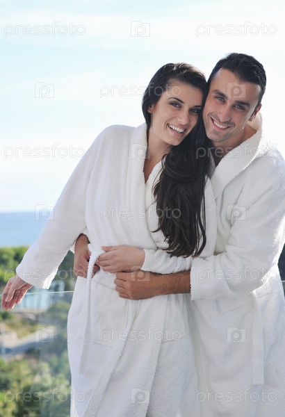 Счастливая молодая пара на балконе с видом на океан