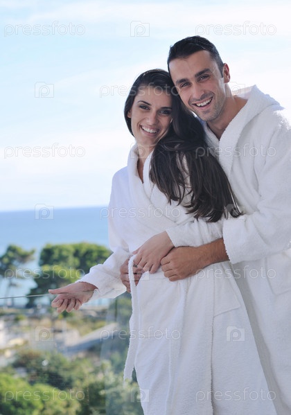 Счастливая молодая пара на балконе с видом на океан