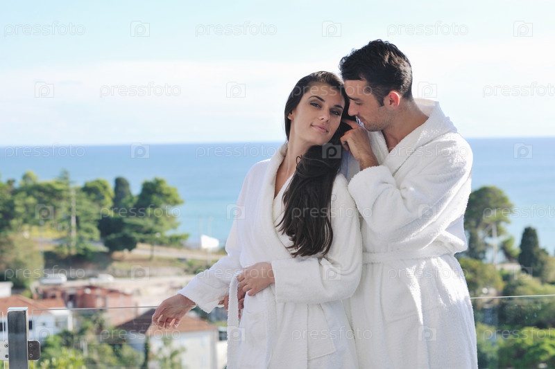 Счастливая молодая пара на балконе с видом на океан
