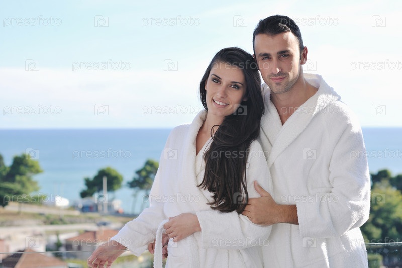 Счастливая молодая пара на балконе с видом на океан