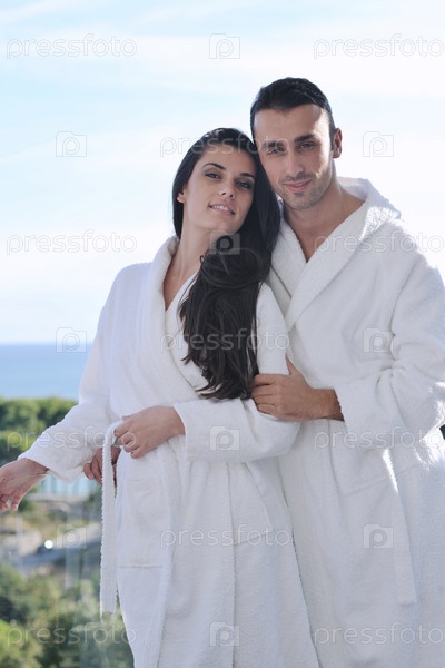 Счастливая молодая пара на балконе с видом на океан