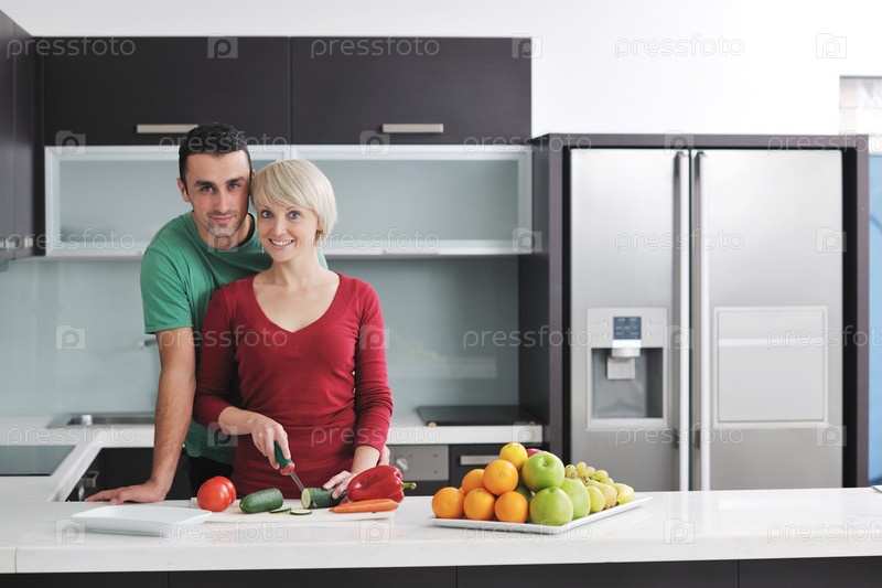 Молодая пара на кухне готовит овощной салат