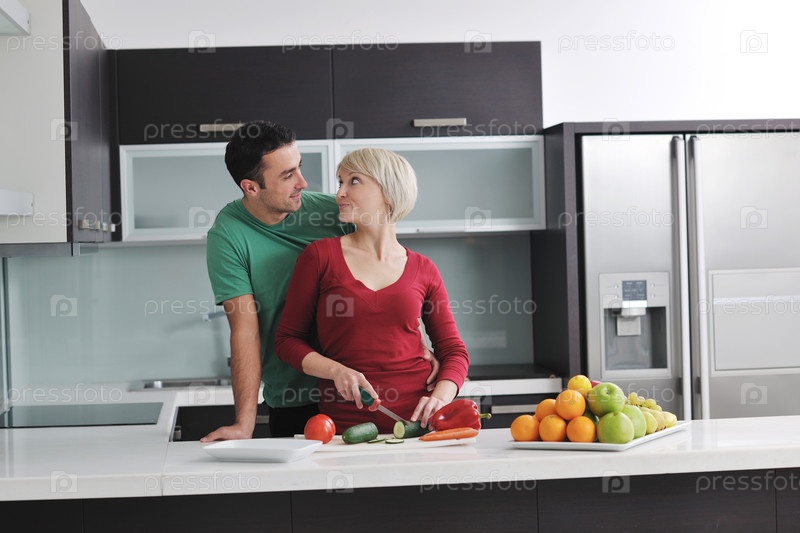 Молодая пара на кухне готовит овощной салат