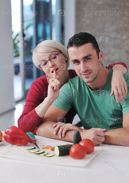 Молодая пара готовит овощной салат на кухне