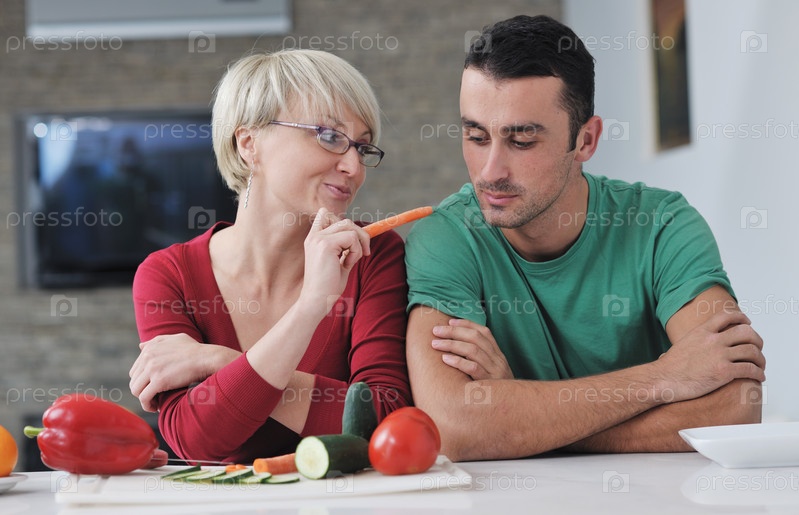 Молодая пара готовит овощной салат на кухне