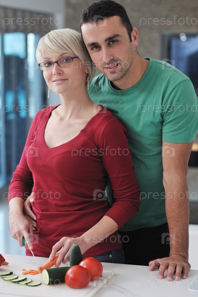 Молодая пара готовит овощной салат на кухне