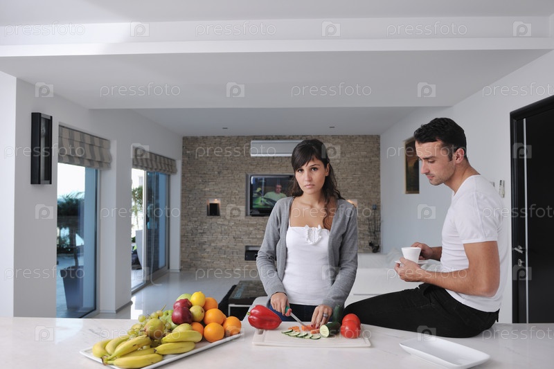 Счастливая молодая пара готовит салат из свежих овощей на кухне