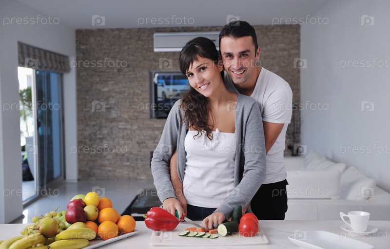 Молодая пара готовит овощной салат на кухне