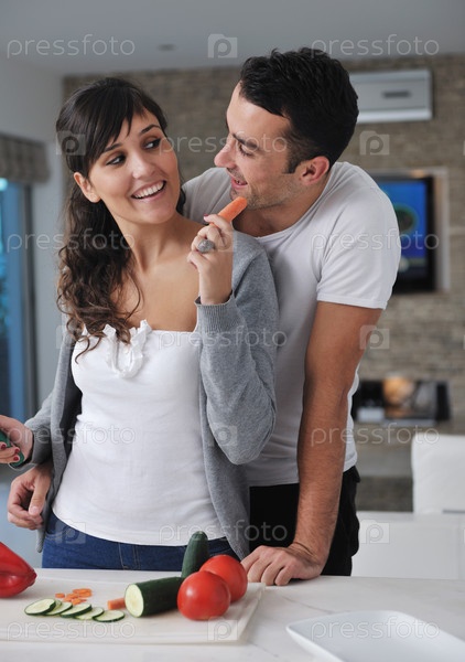Молодая пара готовит овощной салат на кухне