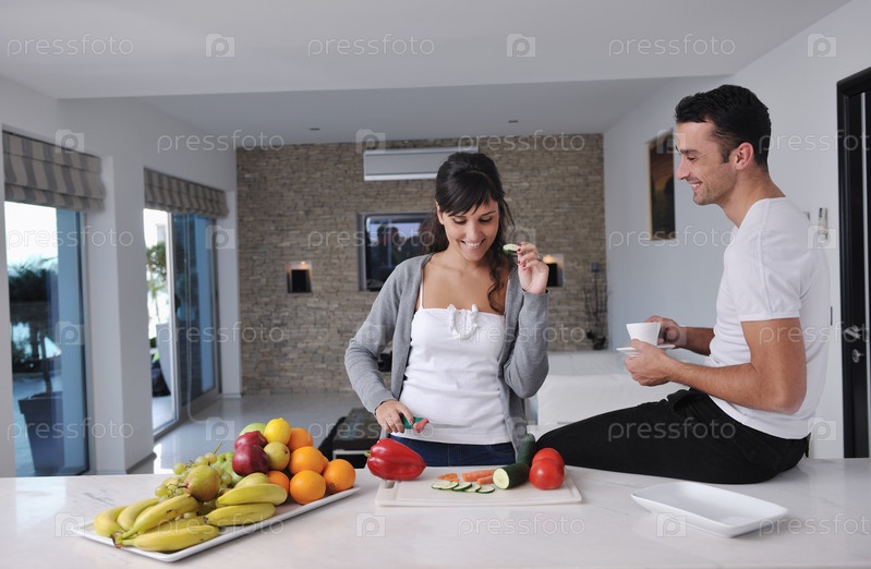 Молодая пара готовит овощной салат на кухне