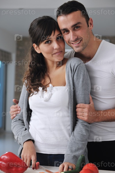 Счастливая молодая пара готовит салат из свежих овощей на кухне