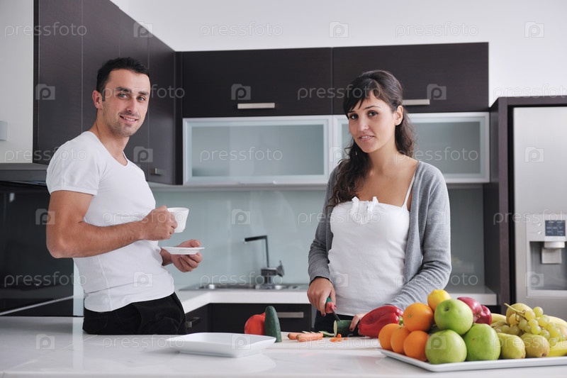 Счастливая молодая пара готовит салат из свежих овощей на кухне