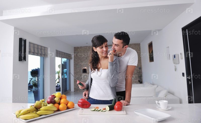 Счастливая молодая пара готовит салат из свежих овощей на кухне