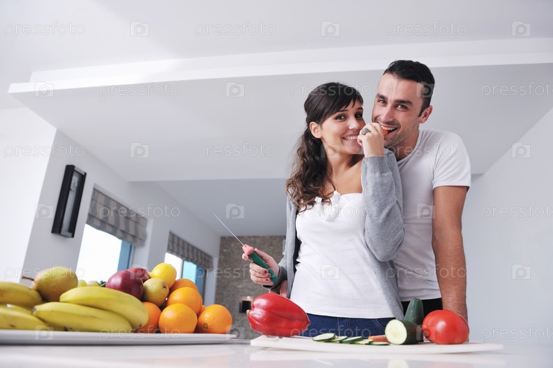 Счастливая молодая пара готовит салат из свежих овощей на кухне