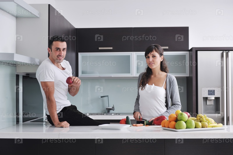 Молодая пара готовит овощной салат на кухне