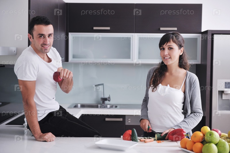 Молодая пара готовит овощной салат на кухне