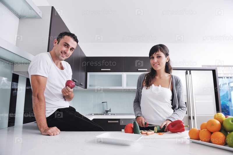 Молодая пара готовит овощной салат на кухне