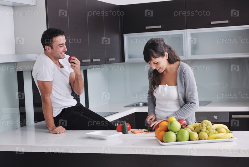 Молодая пара готовит овощной салат на кухне