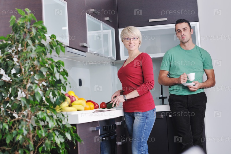 Счастливая молодая пара готовит салат из свежих овощей на кухне