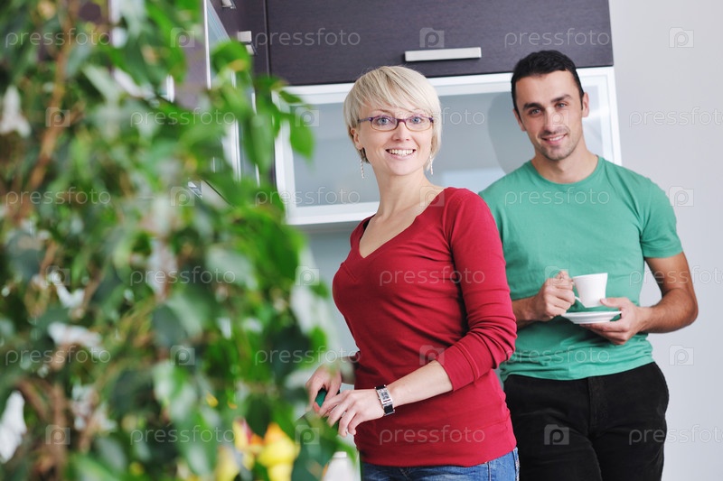 Счастливая молодая пара готовит салат из свежих овощей на кухне