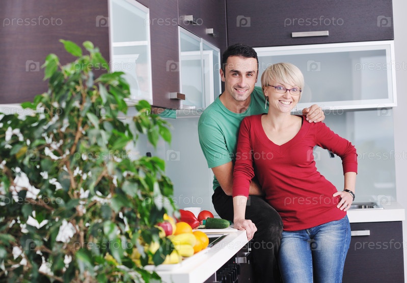 Молодая пара собирается готовить овощной салат на кухне