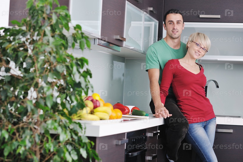 Молодая пара собирается готовить овощной салат на кухне
