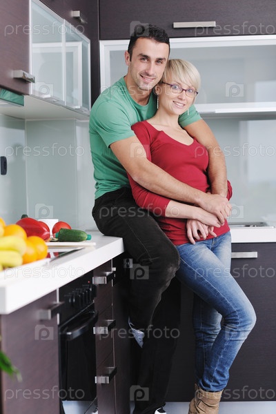 Молодая пара собирается готовить овощной салат на кухне