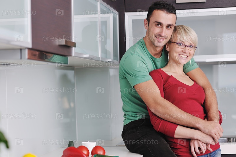 Молодая пара собирается готовить овощной салат на кухне