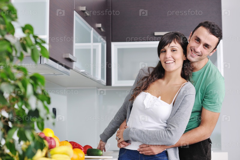 Счастливая молодая пара готовит салат из свежих овощей на кухне