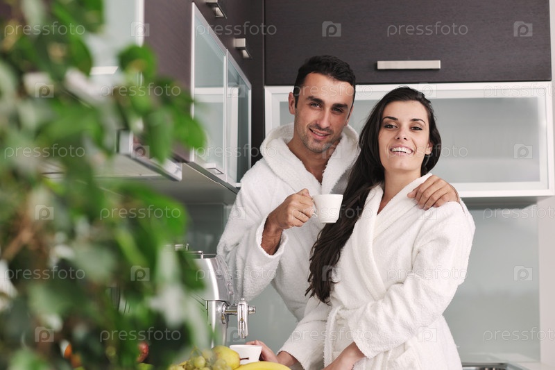Молодая пара пьет кофе утром на кухне