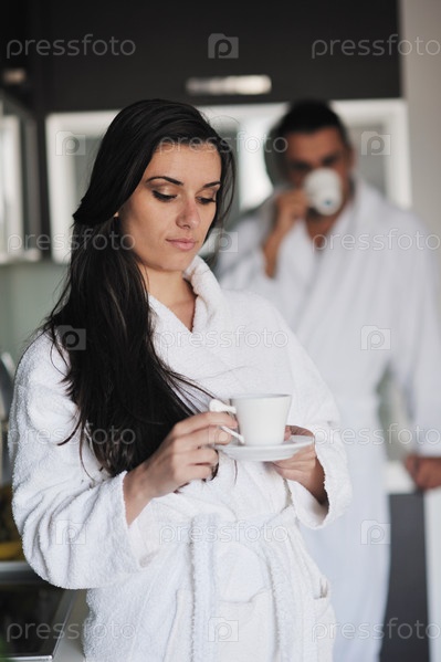 Молодая женщина пьет кофе утром