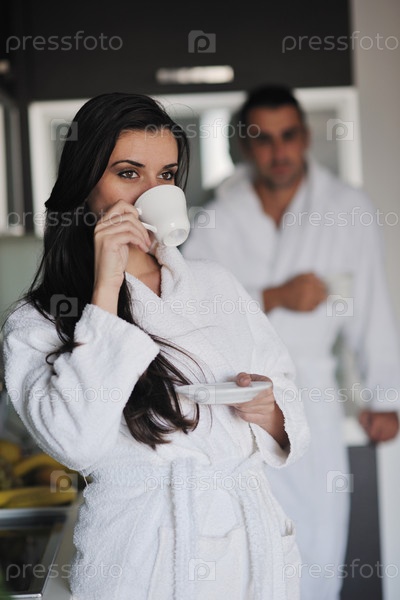 Молодая женщина пьет кофе утром