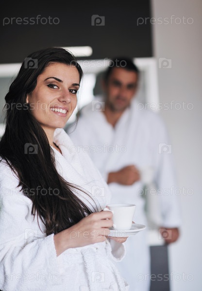 Молодая женщина пьет кофе утром