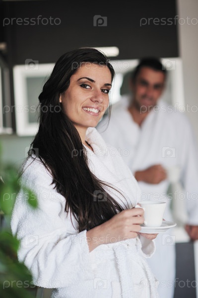 Молодая женщина пьет кофе утром