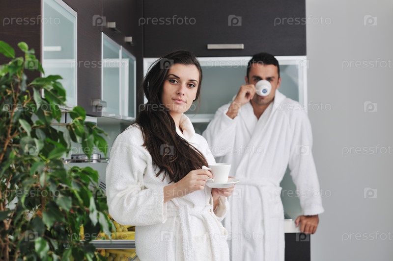 Молодая пара пьет кофе утром на кухне