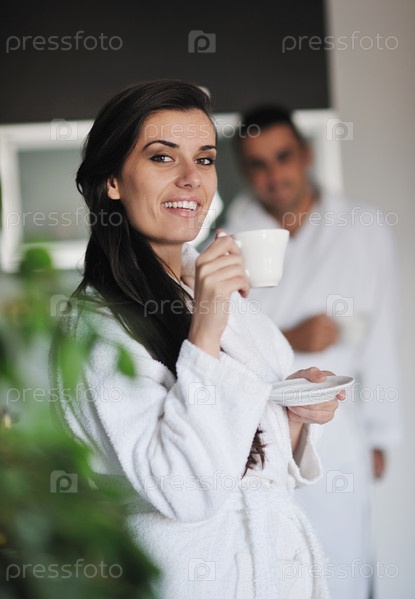 Молодая женщина пьет кофе утром