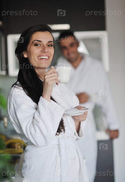 Молодая женщина пьет кофе утром